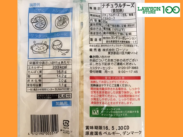 ■ローソンストア100 ベルギー産(もしくはデンマーク産)モッツァレラを60%配合した本格的なミックスチーズ。 内容量65g 原産国:ベルギー・デンマーク