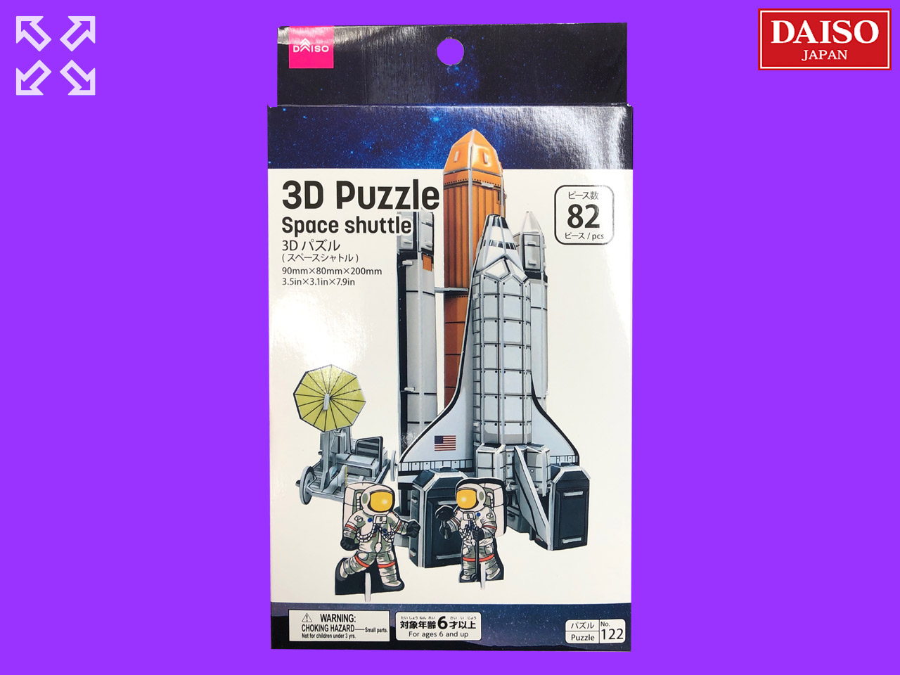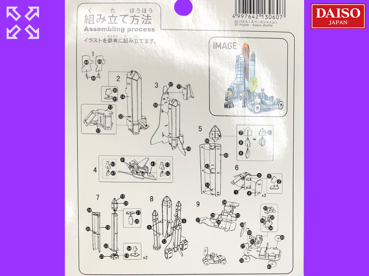 ■ダイソー(2019〜) スチロール製3D立体パズルシリーズから。スペースシャトル。82ピース 完成サイズ:9cm×8cm×20cm (中国製)