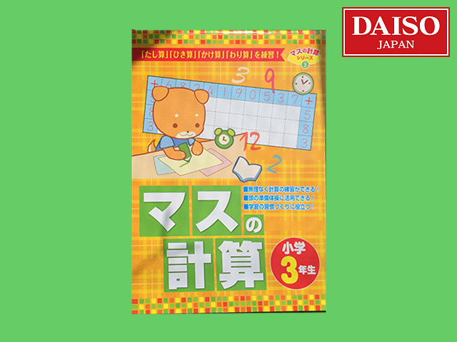 ダイソー ダイソーの書籍シリーズから マス計算3年生用。 「たし算」「ひき算」「かけ算」「わり算」 導入は30マスのたし算から。 100マスのたし算・ひき算・かけ算 わりきれるわり算~あまりのあるわり算まで。