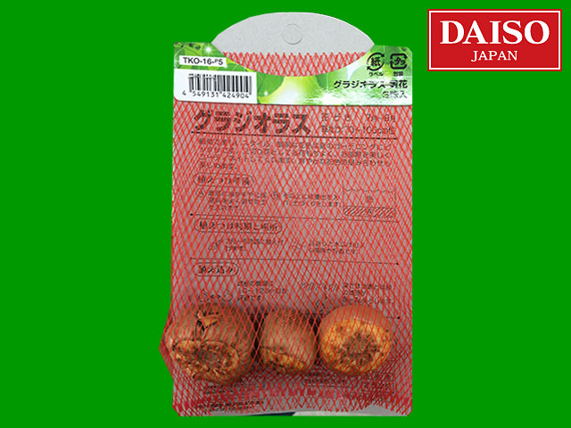 ■ダイソー 球根苗シリーズ グラジオラス 黄花 黄色の鮮明な花色は夏のガーデニングにぴったり。 花持ちが良いので切り花としても楽しめる。 花どき:7月~9月 草たけ:70~100cm 植え付け時期:3月~6月 植え付け場所:日当たりと水はけのいい場所 生産地:オランダ 品種:リモンセロ 3球入り