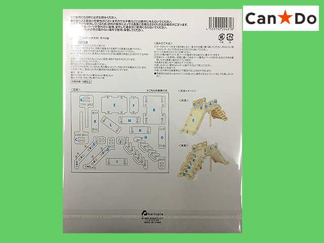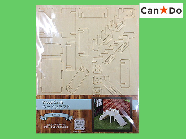 キャンドゥ ウッドクラフト。洋風シリーズから 庭アイテム すべり台 一枚の板から各部品を抜き取って組み立てていく工作品。 洋風、和風等、各種シリーズとして揃っている。 抜き取った部品を付属の紙やすりで滑らかにしたら、設計図に合わせて順番通り組み立てると出来上がる。 ニス塗りや塗装をしてよりリアリティを出すことも。 某有名ミニチュア玩具の○○ファミリーシリーズにもぴったりと、ファンが多い。 本体サイズ 28.5×18.5  紙やすり1枚付き 組立難易度 ★★ (中国製)