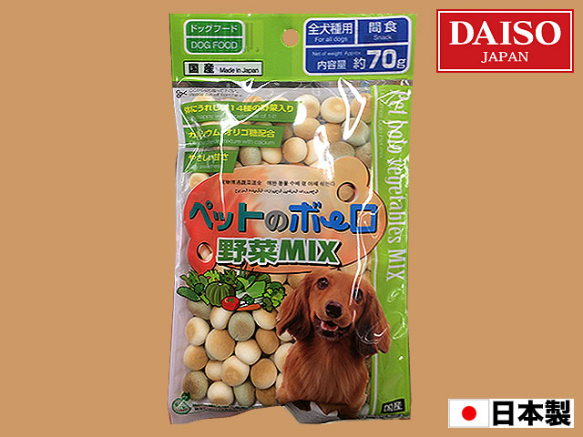 ダイソー 犬用のおやつ。 カルシウム・オリゴ糖配合。やさしい甘さのボーロ。70g入り。 14種の野菜成分配合のものもある。 小さいオヤツは、しつけ向き。 (日本製)
