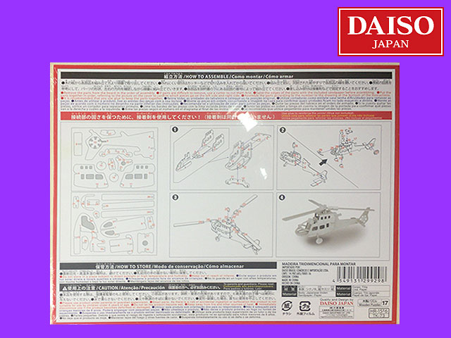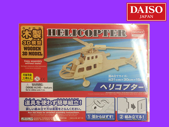■ダイソー(2016〜) 木製3D模型シリーズから、ヘリコプター 組立上がりサイズ: 31cm×30cm×15cm 材質:シナノキ 板2枚組 紙やすり1枚付き 組立難易度 ★